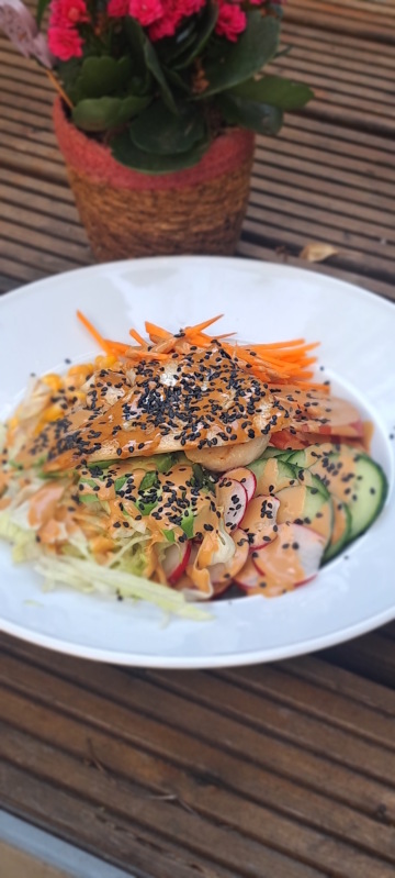 míchaný zeleninový salát s pečeným okouníkem, avokádem,