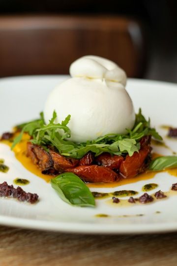 mozzarella burrata s ragú z pečených rajčat, rukolou, olivovou tapenádou a pestem