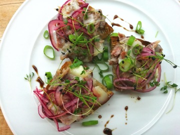 s trhaným husím masem, pečenou dýní, čerstvými bylinkami a redukcí z červeného vína
